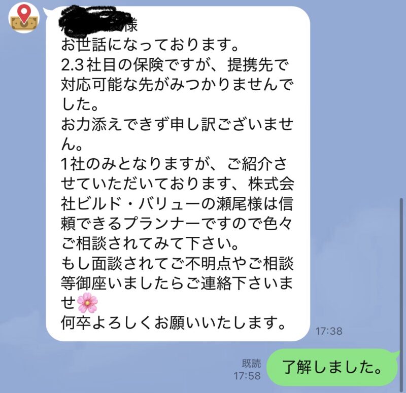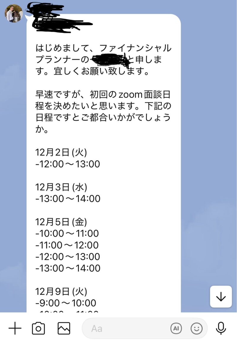 また、複数のFPの方と相談する予定でしたが以下のようなLINEが送られてきました。